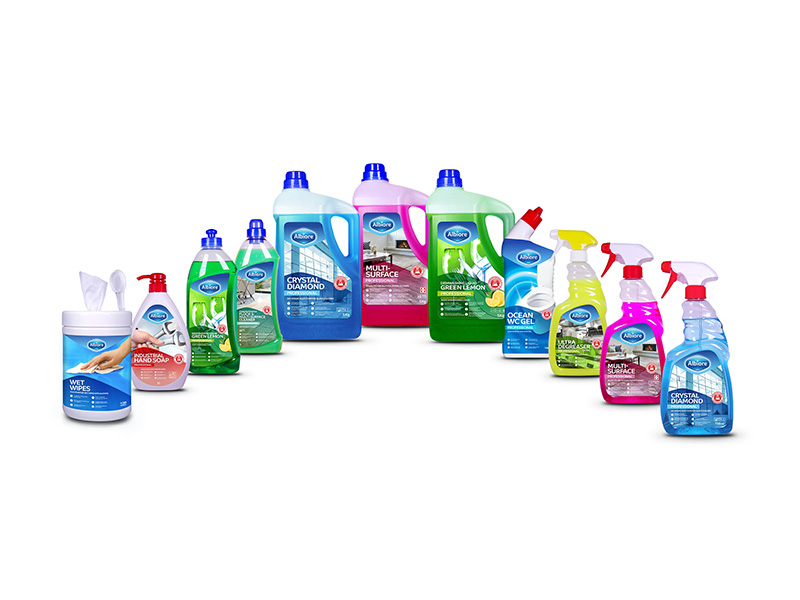 Diseño y desarrollo de packaging para Albiore, la nueva marca para productos de limpieza, droguería y accesorios del grupo Adveo