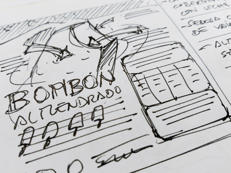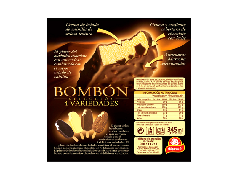 Estuche de tres unidades para bombón helado almendrado. La imagen pretende transmitir una atmósfera exótica, casi de Las Mil y Una Noches, estando dirigida a un target adulto y exigente.