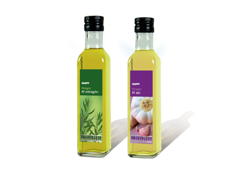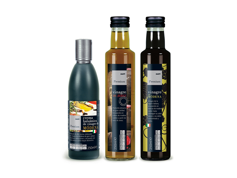 Vinagres Grupo El Árbol Al estragón y al ajo para la marca Super. Variedad Módena y Jerez para la gama Premium.